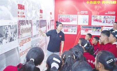 “十四五”期间,天津体育学院主办的“国家荣誉——中国女排精神展”累计观展超100万人次,天津体育学院奥运冠军教师为参展观众讲解女排精神展。(图片来源:天津体育学院)