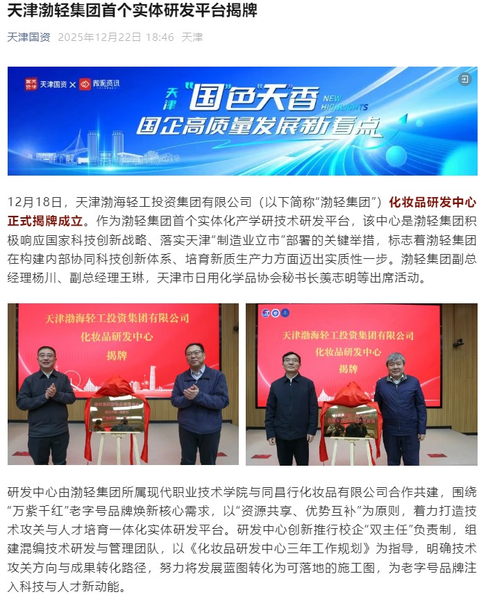 12月18日,天津渤海轻工投资集团有限公司(以下简称“渤轻集团”)化妆品研发中心正式揭牌成立。作为渤轻集团首个实体化产学研技术研发平台,该中心是渤轻集团积极响应国家科技创新战略、落实天津“制造业立市”部署的关键举措,标志着渤轻集团在构建内部协同科技创新体系、培育新质生产力方面迈出实质性一步。渤轻集团副总经理杨川、副总经理王琳,天津市日用化学品协会秘书长羡志明等出席活动。