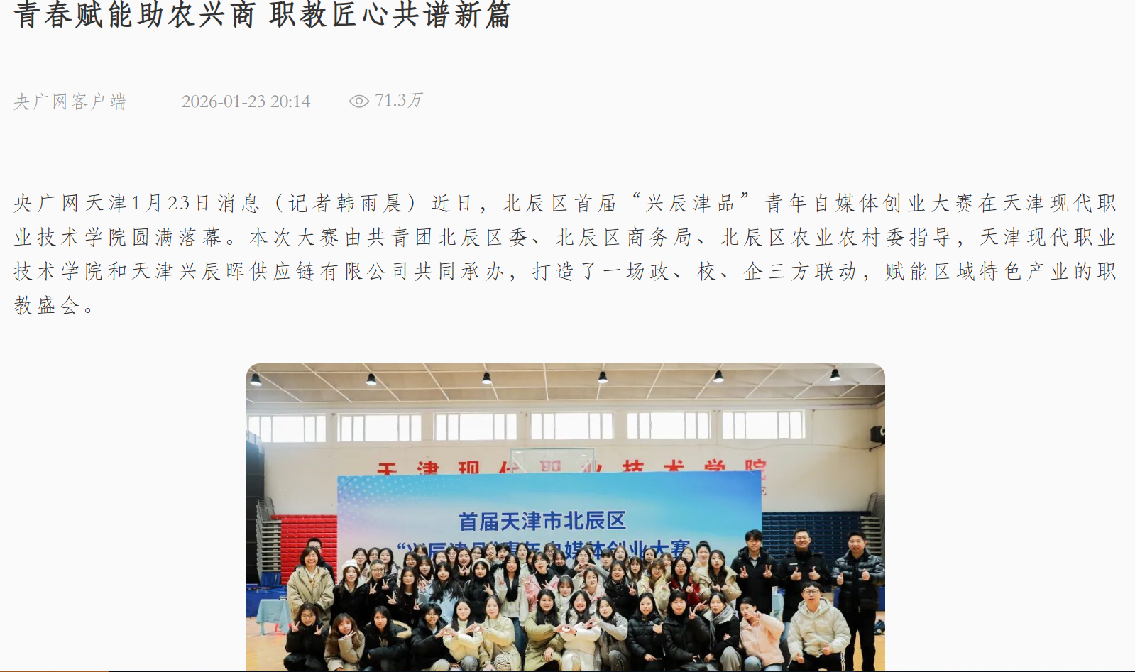 央广网天津1月23日消息(记者韩雨晨)近日,北辰区首届“兴辰津品”青年自媒体创业大赛在天津现代职业技术学院圆满落幕。本次大赛由共青团北辰区委、北辰区商务局、北辰区农业农村委指导,天津现代职业技术学院和天津兴辰晖供应链有限公司共同承办,打造了一场政、校、企三方联动,赋能区域特色产业的职教盛会。