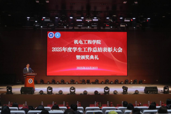 为全面回顾2025年学生工作成果,表彰在学术竞赛、技能实践、文体活动、志愿服务等领域表现突出的优秀集体与个人,凝聚青春力量、激发奋进斗志,12月26日下午,机电工程学院在现代学院报告厅组织开展2025年度学生工作总结表彰大会暨颁奖典礼。学校领导程非凡、韩淑君、张新鹏及学工部负责同志出席活动,机电工程学院领导班子成员和机电工程学院全体辅导员老师、教务老师及400余名学生共同见证这一荣耀时刻。
