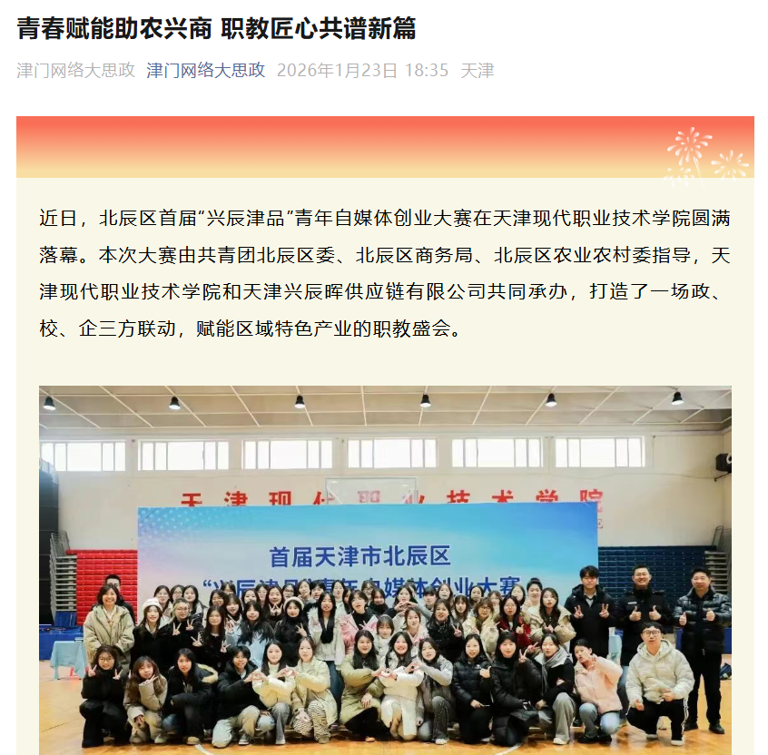近日,北辰区首届“兴辰津品”青年自媒体创业大赛在天津现代职业技术学院圆满落幕。本次大赛由共青团北辰区委、北辰区商务局、北辰区农业农村委指导,天津现代职业技术学院和天津兴辰晖供应链有限公司共同承办,打造了一场政、校、企三方联动,赋能区域特色产业的职教盛会。