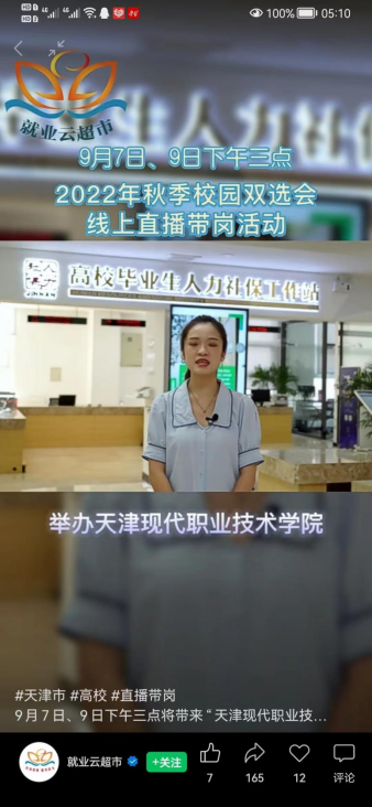 为了让毕业生更直观的了解企业岗位需求,学院与津南人社合作,利用就业云超市平台在9月7日和9日下午举办现代学院直播带岗活动。
