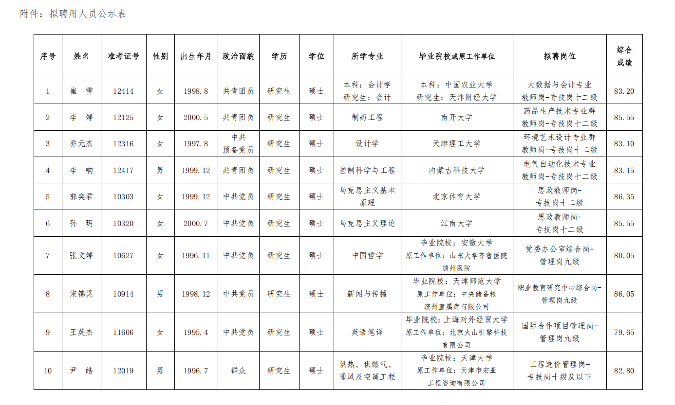 按照《2025年天津现代职业技术学院公开招聘事业编制人员实施方案》要求,现将拟聘用人员予以公示。
