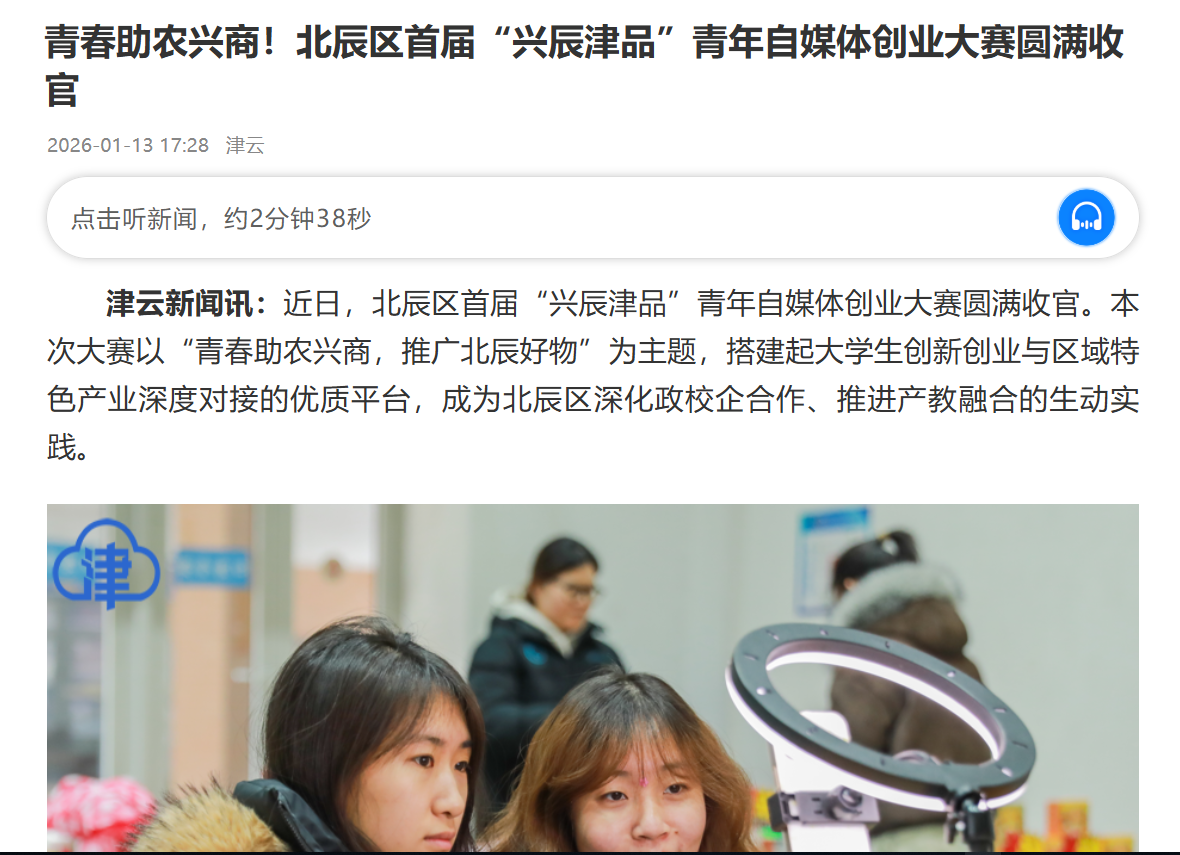 津云新闻讯:近日,北辰区首届“兴辰津品”青年自媒体创业大赛圆满收官。本次大赛以“青春助农兴商,推广北辰好物”为主题,搭建起大学生创新创业与区域特色产业深度对接的优质平台,成为北辰区深化政校企合作、推进产教融合的生动实践。