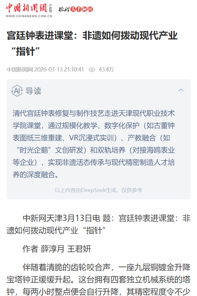 据了解,目前已有数十名毕业生输送至天津海鸥表业等知名企业,实现了从“非遗学徒”到“企业准工匠”的身份跨越。康宁表示:“依托这一传承体验基地,我们不仅是在传承一项传统技艺,更是在探索职业教育如何服务地方产业。”(完)